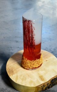 A refreshing slider of Van Ryn’s 10YO brandy, Pierre Jourdan Ratafia, nutmeg pelargonium and raspberry-peppercorn shrub served in a Collins glass. This is a cocktail in surround sound: when you remove its wooden cover a faintly bitter juniper smoke is released; touch the glass and you’ll feel the sandy and bumpy textures of the hibiscus powder, honey and toasted sesame seeds coating its outside; then alternate your sips with finger swabs of these sweet and savoury garnishes for a taste sensation.